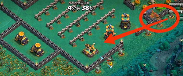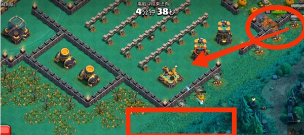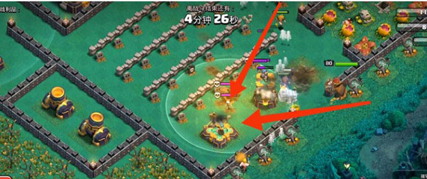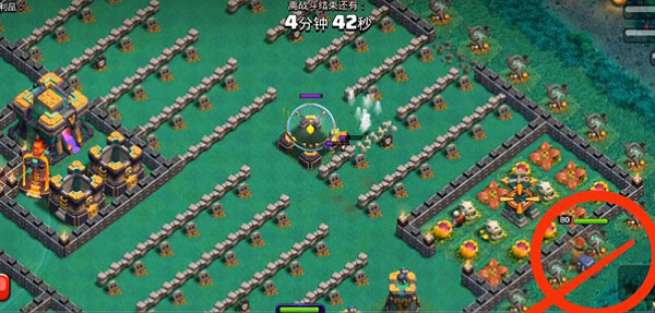 5、当女王攻击炸弹塔时,在下方标记区域投放约10个野蛮人(可配合南瓜道具),用于吸引X连弩火力,进一步保障女王与女武神的生存。