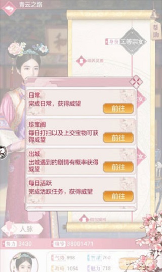 1、威望值代表游戏中女主角的社会声望,是提升角色身份等级的关键指标。