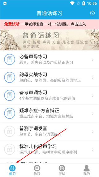 1、打开软件进入普通话练习页面,浏览必备声母练习韵母实战练习等分类,点击底部教程按钮切换到学习教程界面;