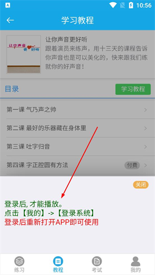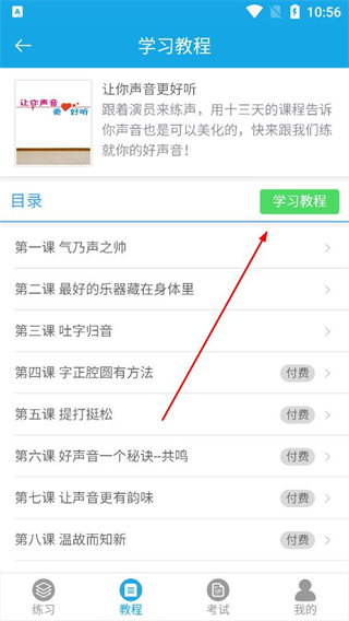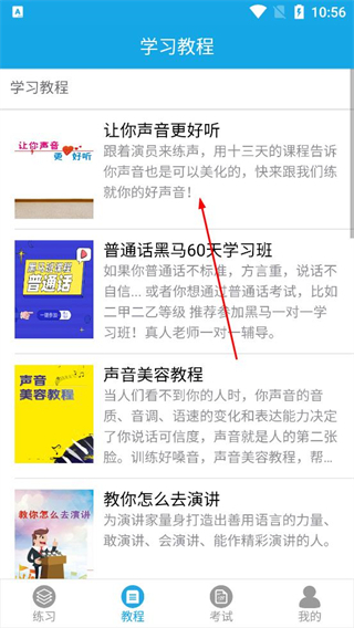2、在学习教程页面选择让你声音更好听的课程条目,查看课程简介,点击进入该课程的详细目录页面;