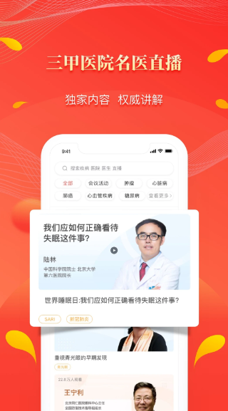 1、【科普直播】 全国三甲医院名医,主任医师以上级别医生在线直播。每周数位知名专家与网友就疾病与健康的常见话题进行实时互动。