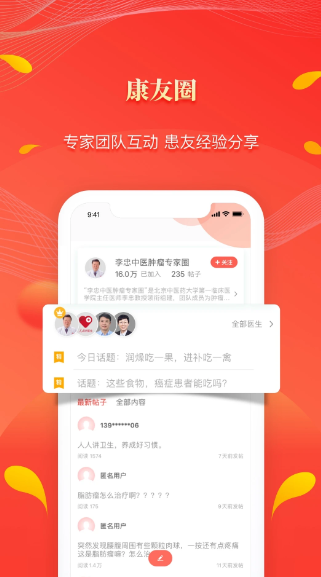 2、【康友圈】 三甲公立医院专家带领医疗团队入驻,建立专家官方的医患交流平台。提供免费的健康咨询服务,连接同种疾病患友,分享彼此的经验感受。