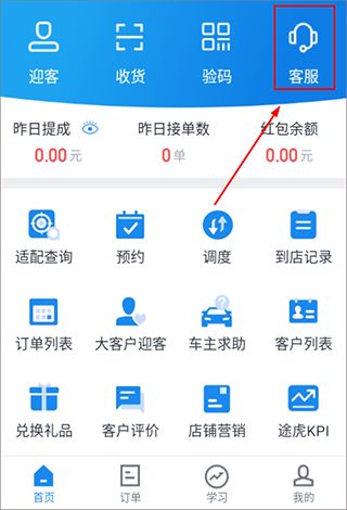 1、打开途虎商户APP,首页右上角即可找到【客服】入口