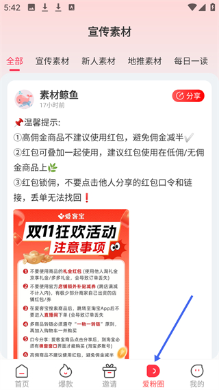 3、爱粉圈页面素材鲸鱼发布双11狂欢活动温馨提示,包括高佣金商品用红包、红包叠加使用等注意事项助力用户参与活动;