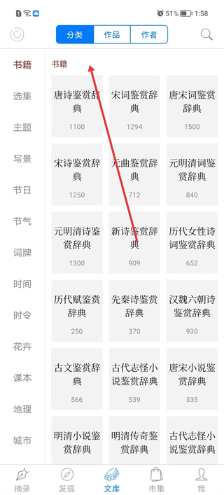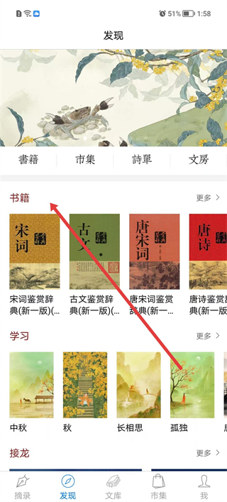 1、进入发现页面的书籍板块,可浏览宋词鉴赏辞典与古文鉴赏辞典等经典文学作品选集;