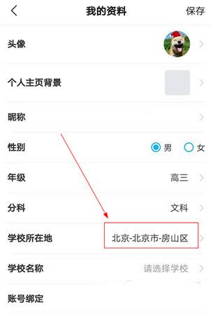 2、在”我的资料“界面可以很清除的看到当前的个人信息,想要修改所在地区的用户选择“学校所在地”修改即可。
