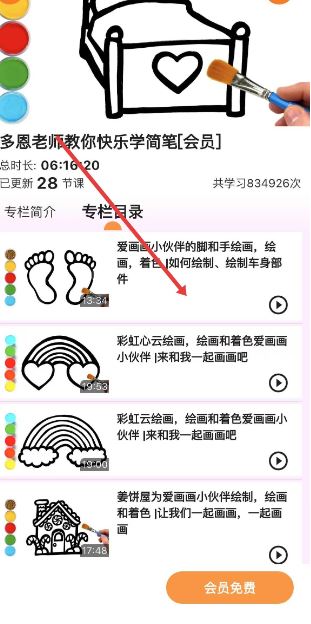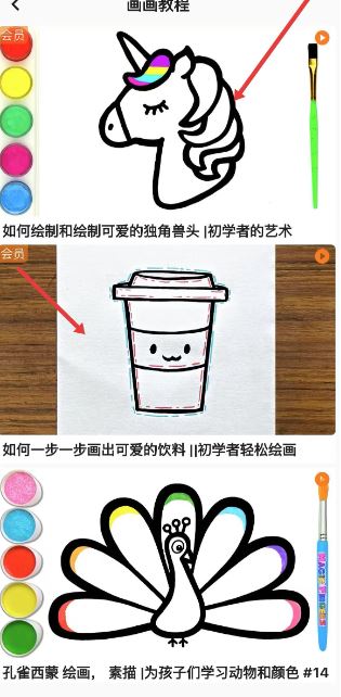 2、画画教程页面,展示了如何绘制可爱的独角兽头、饮料等适合初学者的绘画教程,还有孔雀西蒙绘画等内容。