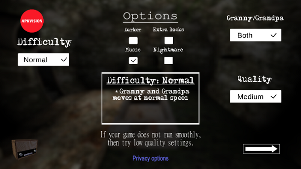 1、下载并安装《恐怖奶奶2》,启动游戏后点击“Play”。在主厅选择难度,新手建议先使用“练习”模式熟悉操作与流程。