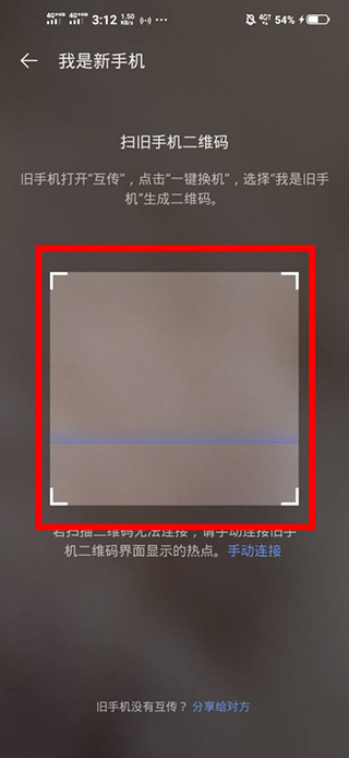 10、新手机屏幕将出现扫描框,对准旧手机上的二维码进行扫描,即可开始一键迁移数据。