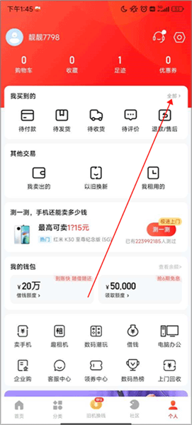 2、在“我的”界面,点击“我买到的”按钮,查看所有订单。