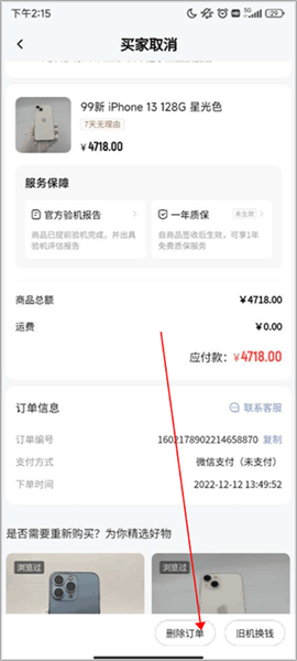 3、进入“我的订单”界面,找到需要删除的订单,点击“删除订单”按钮。