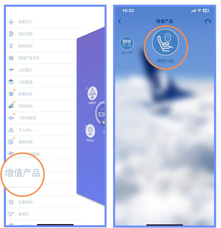 6、任意渠道购买的机票,通过【行程管理】或【增值产品】199元起抢头等舱,尊享头等舱座椅,头等舱餐食、头等舱休息室、优先登机等权益,舒适旅途,从此不同;