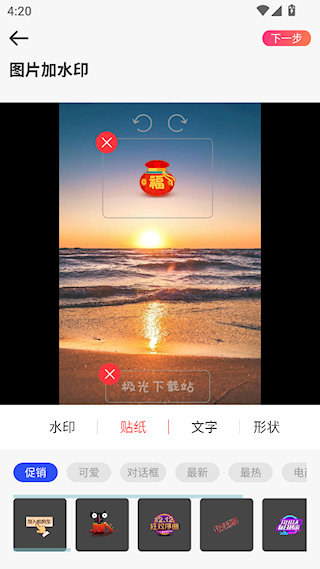 4、移调整贴纸的位置和大小,完成后点击下一步,保存到相册。