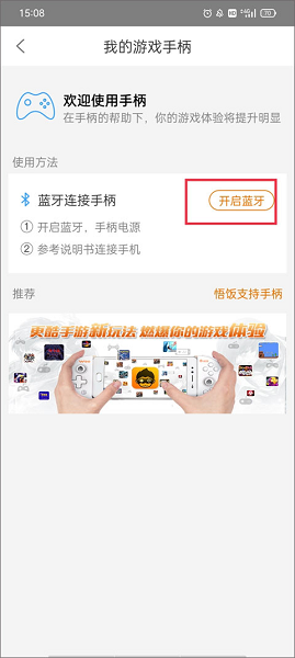 2、进入页面后点击【开启蓝牙】,将手机与游戏手柄进行配对连接。