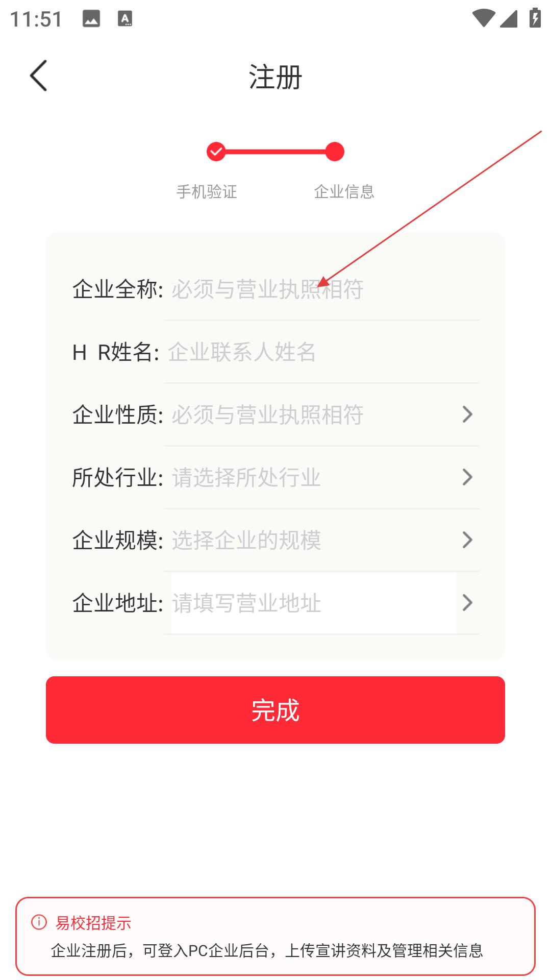 3、注册界面,用户需填写企业全称、HR姓名等企业信息,完成注册后可登录PC企业后台上传宣讲资料及管理相关信息。