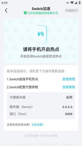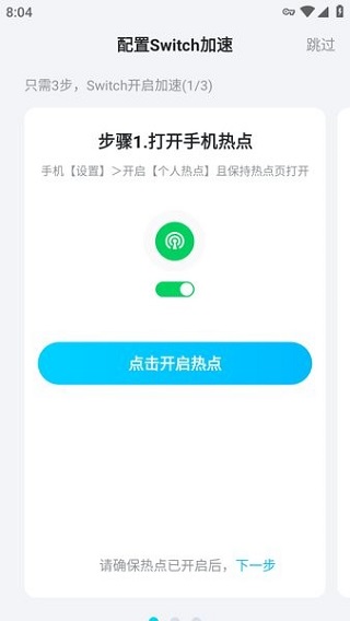 4、点击中间的图标启动游戏,进入“配置Switch加速”步骤。第一步请开启手机热点。