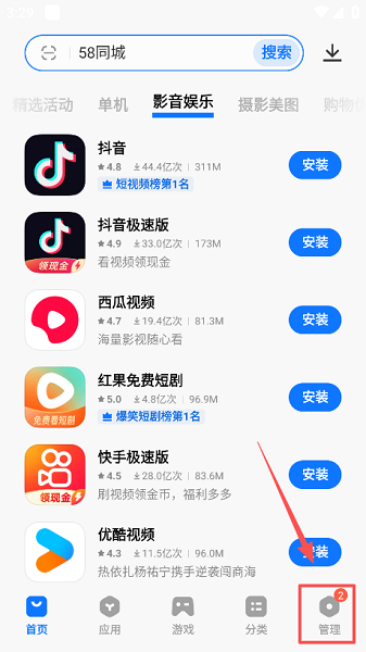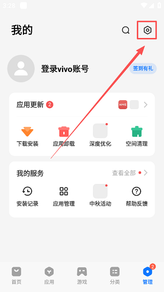 1、打开vivo应用商店,点击右下角“我的”或“管理”选项。