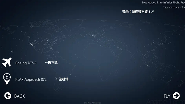 1、带有飞机图标为飞机选择项,点击可选取驾驶机型。图标旁带绿色箭头的表示可下载飞机,选中后点击机图下方的“…free Dow…”即可下载。Back为返回键。