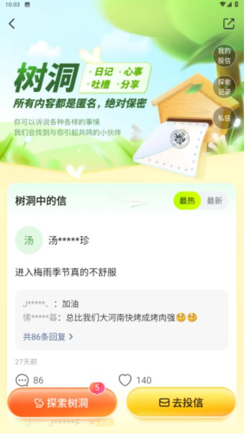 一个畅所欲言的场所,所有内容都是匿名且绝对保密。你只管分享,我们会找到与你共鸣的小伙伴,还可以和志同道合的姐妹进行私聊,来多交几个好朋友。