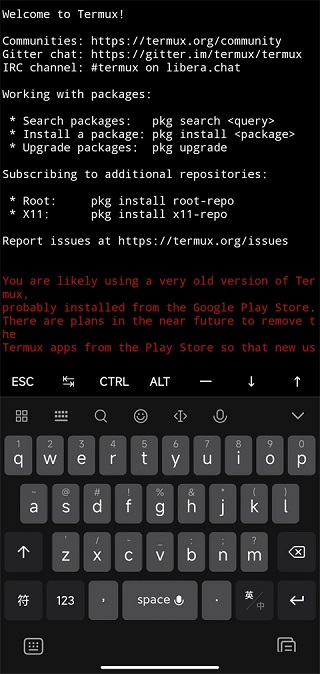 安装好后,可以看到以下的界面,这是一个模拟终端,并不能运行Linux环境下的二进制程序。但是Termux下可以安装proot-distro,这个软件可以在Termux存储空间内部署一个真正的Linux环境。