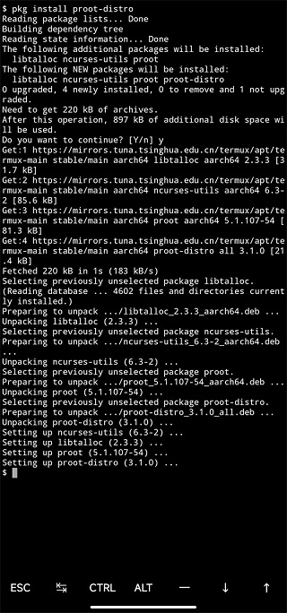 在换好源后,使用pkg update更新Termux软件源。之后使用pkg install proot-distro安装proot-distro,效果如下所示。