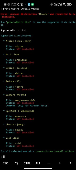 proot-distro支持几乎所有常用的Linux发行版:Alpine、Arch、Debian、ubuntu、manjaro等等。