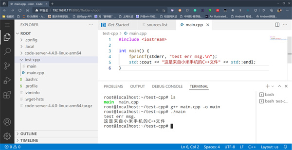 一切准备就绪了,为了方便写代码,我们使用电脑访问手机上的VSCode Server,简单写一段程序,并编译试试?