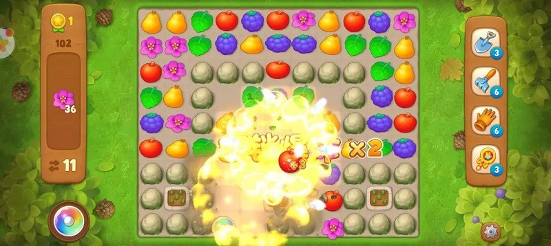 1. 开局入眼的便是石头,石头比较坚硬,但必须要清理。上方紫色的元素可以组成一个炸弹,坚硬的石头必须用加速道具,才炸出一条裂缝,若是多个炸弹同时爆炸,会一次性清理掉,若是没有,就在有裂缝的石头旁匹配
