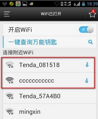 2、扫描结果中显示带有两把蓝色钥匙图标的网络,表示该WiFi可尝试连接。