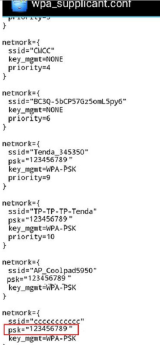 5、打开 wpa_supplicant.conf 文件,末尾可见类似记录:ssid="ccccccccc" 对应WiFi名称,psk="123456789" 则为共享密码。