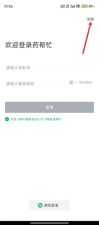 1、打开药帮忙的登录界面,找到右上角的【注册】按钮,进入注册页面啦;