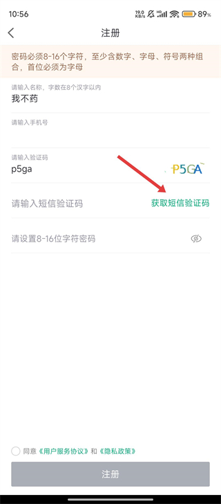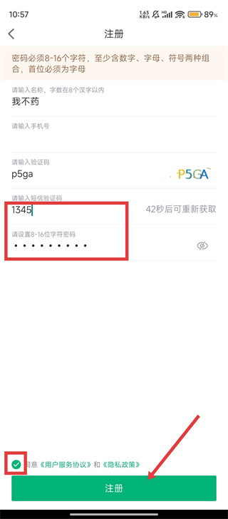 4、输入【短信验证码】,设置【8-16位字符密码】,勾选协议后点击【注册】按钮即可完成药帮忙的账号注册。