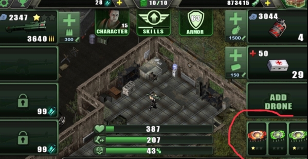 4、角色界面右下角有三个芯片插槽,个人推荐配置为一红二绿。红色芯片提升生命值,绿色芯片增加攻击力,蓝色芯片则提高移动速度。生命值无需堆叠过高,400点左右已足够,游戏中医疗包资源较为充裕。即便将血量提升至1200,若输出不足仍难以应对敌人。蓝色移速芯片可根据喜好选择,适合初始移动较慢的男性角色使用。