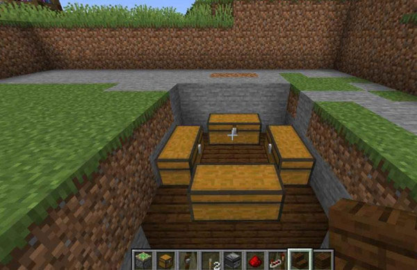 4、在红石结构上铺设一层木板,再覆盖一层楼梯方块。