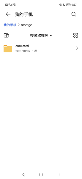 6、在“storage”文件夹内找到“emulated”文件夹,进入后即为百度手机助手的默认下载目录。