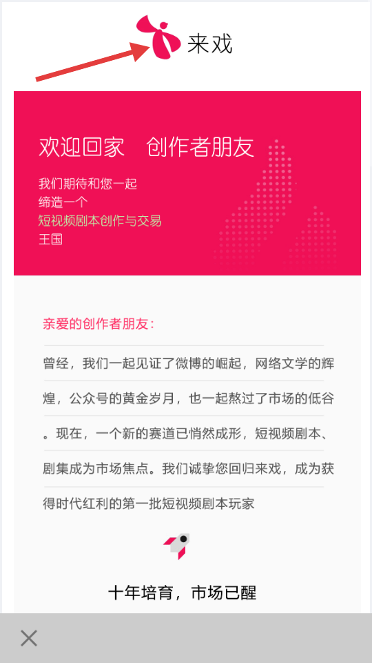3、来戏页面欢迎创作者,回顾市场变化,聚焦短视频剧本创作交易,邀用户共享时代红利开拓创作新赛道;