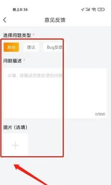 3、编辑反馈并提交:进入“BUG反馈”页面后,编辑要反馈的问题内容,若有相关图片可上传,同时选择问题类型,最后点击提交按钮。
