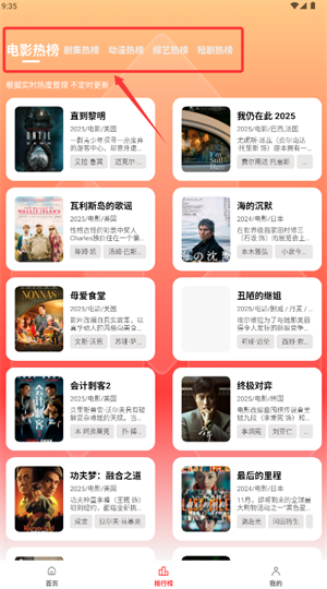 2、点击底部“排行榜”图标,可查看电影、电视剧等热门排行。