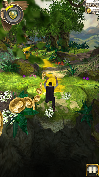神庙逃亡魔境仙踪是一款全新的无限逃亡游戏,将尖叫着飞行的狒狒们抛在身后,以转弯、跳跃和滑行等方式穿越这片土地。游戏的画面色彩方面相较系列其他作品明亮丰富了许多,森林里各种景物的表现也十分细致,但鲜艳的色彩在某些需要转弯的地方意味着难度增高,可能偶尔会有看不清楚路的情况,也可能是在下老眼昏花,这点就见仁见智了。游戏过程中收集金币会补充左上角的技能槽,充满后双击屏幕任意位置就可以使用该技能。