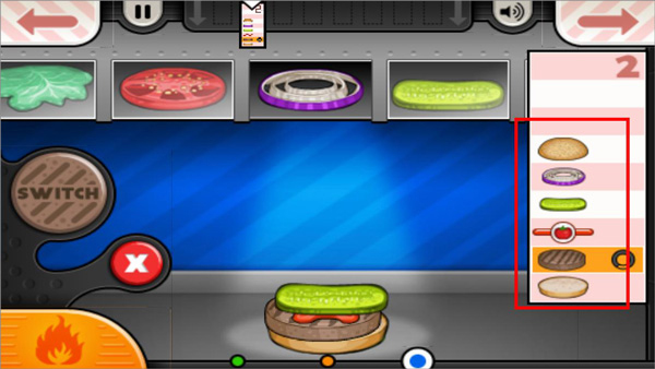 3、点击右下角按钮切换至烧烤工作台,根据订单要求开始制作汉堡。