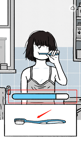 4、起得有点晚,得赶紧洗漱。点击画面中的牙刷,左右滑动操作,直到上方的进度条满格,刷牙就完成了。