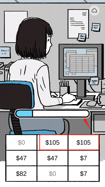 6、终于到公司了,开始投入工作。点击桌面上两张面额相同的钞票,配对消除,直到进度条满格,今天的工作任务就算顺利完成。