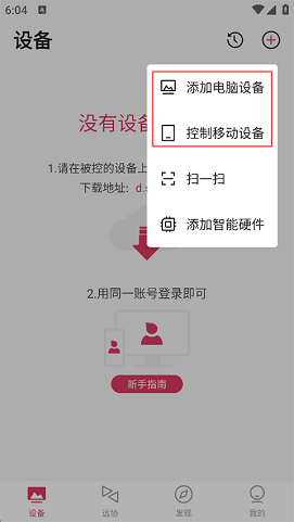 2、在弹出的功能列表中,根据需要选择“添加电脑”或“控制移动设备”。