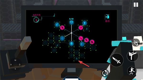 2、随后移动到配备大型显示屏的设备前,按E键即可进入角色升级界面。