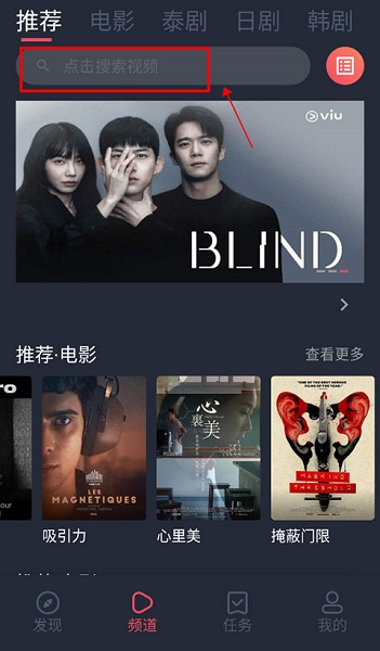 1、进入“频道”页面,在顶部搜索栏输入你想观看的剧集名称。