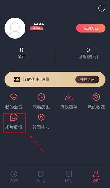 5、若未找到想看的剧集,可进入“我的”页面,点击“求片反馈”提交你的观看需求。