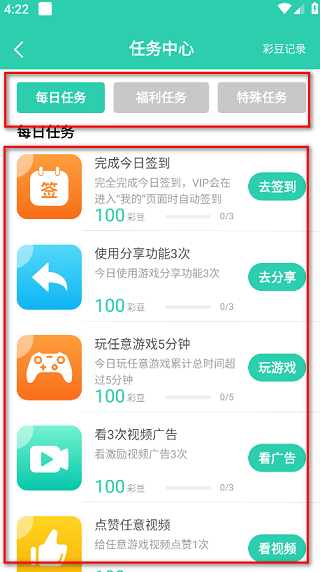5、通过完成每日任务、福利任务及特殊任务,均可积累金豆奖励。