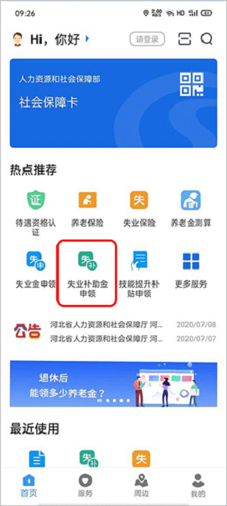 1、在河北人社APP首页找到并点击【失业补助金申领】功能。