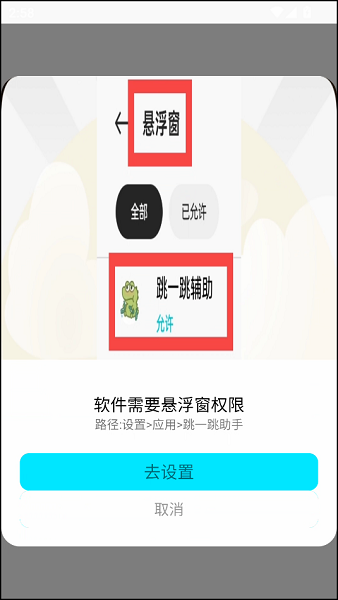 1、打开软件后,系统首先会提示进行悬浮窗权限设置,请点击“去设置”。