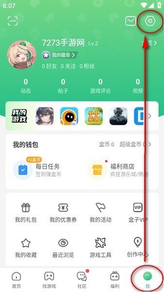 1、进入4399游戏盒后,选择右下角“我”的页面,点击左上角齿轮图标进入设置,具体位置可参考界面图示。